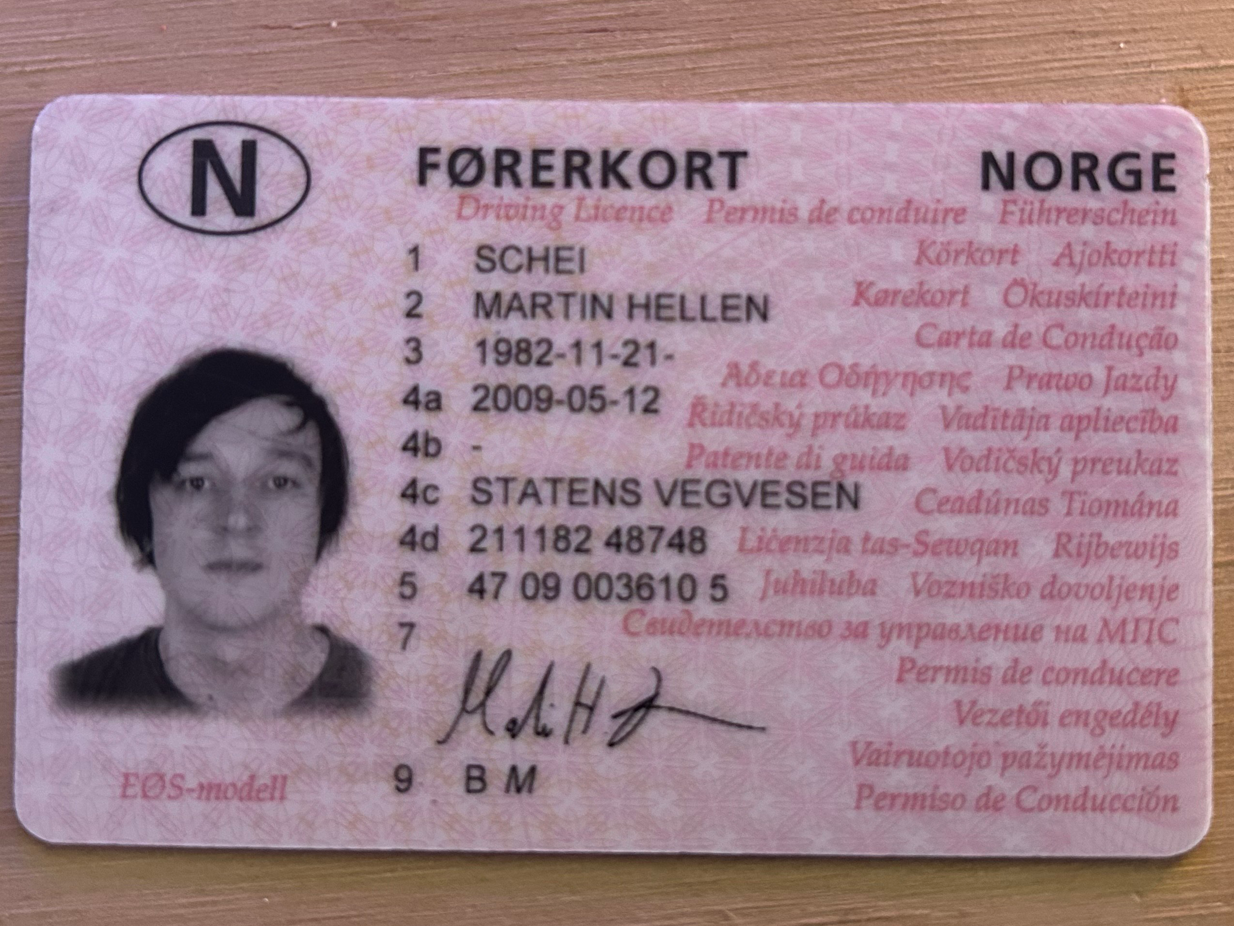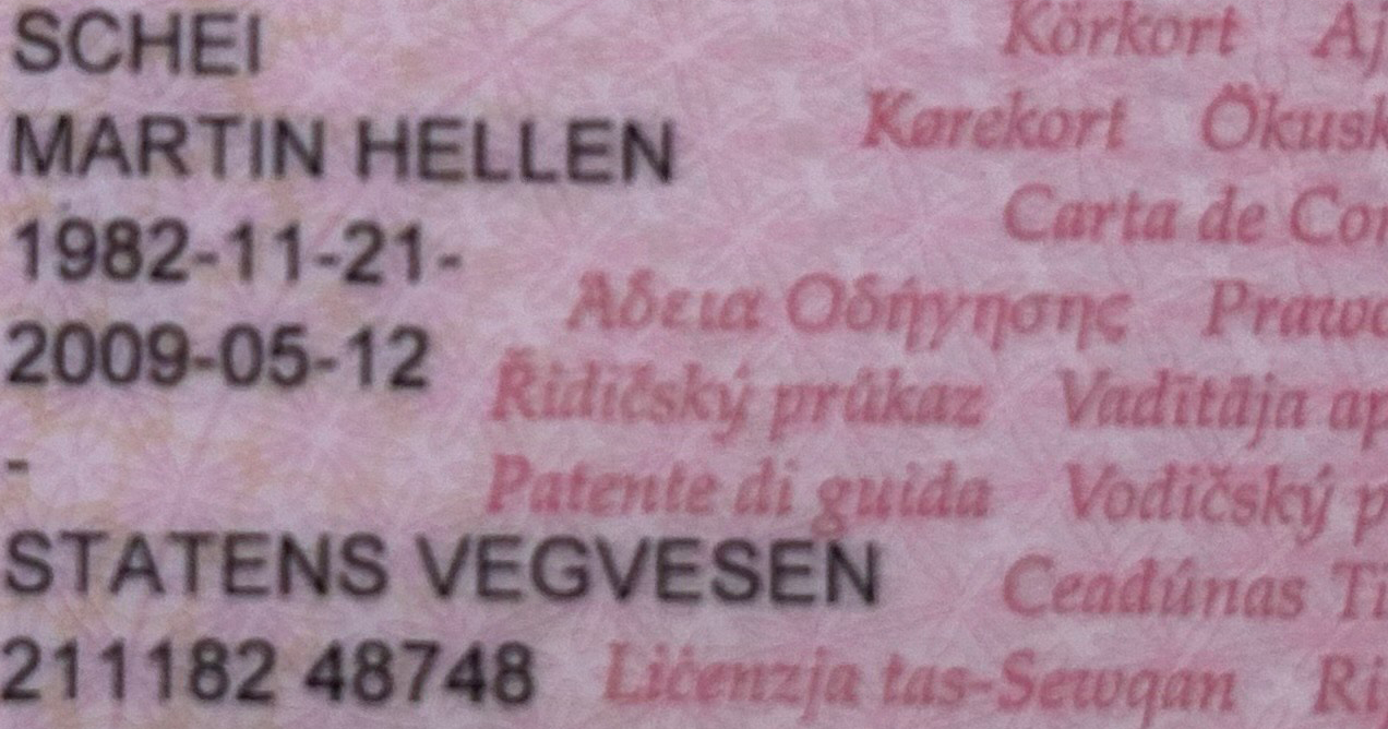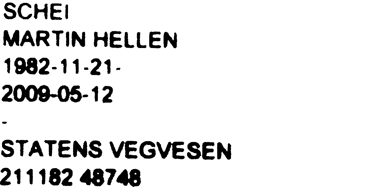 ["SCHE","MARTIN HELLEN","1982-11-21-","2009-05-12","STATENS VEGVESEN","211182 48748"]